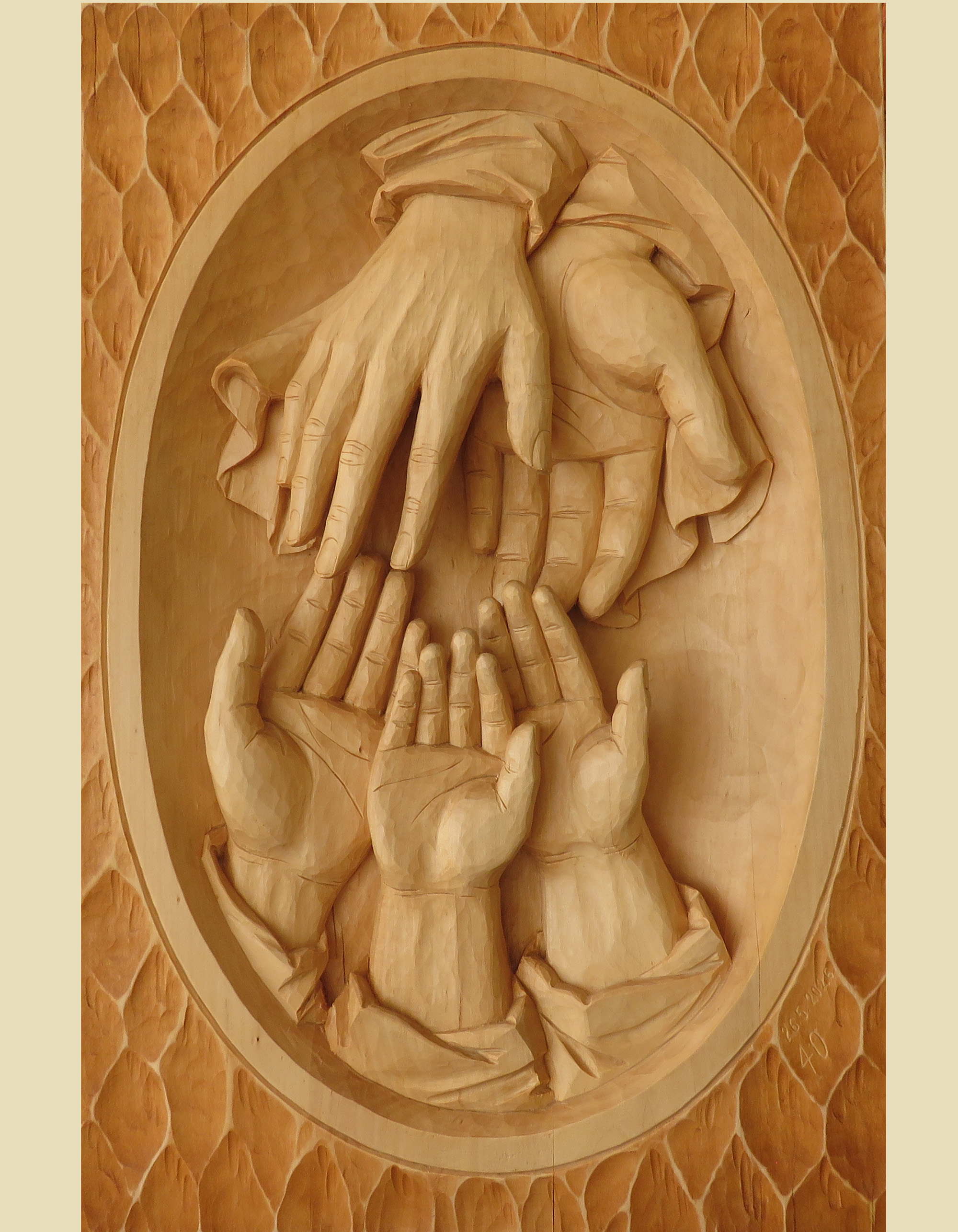 Tento rezbársky reliéf má výšku 60cm a znázorňuje ruky rodinných príslušníkov. Ľavá horná ruka patrí matke rodiny, pravá otcovi, a spodné trom súrodencom. Jedná sa o originálnu drevorezbu, vyrezanú ručne v našom ateliéri technikou hlbokého reliéfu z lipobého dreva. Povrch drevorezby bol na orámovaní jemne morený, aby vynikli samotné vyrezávané …[viac fotografií]
