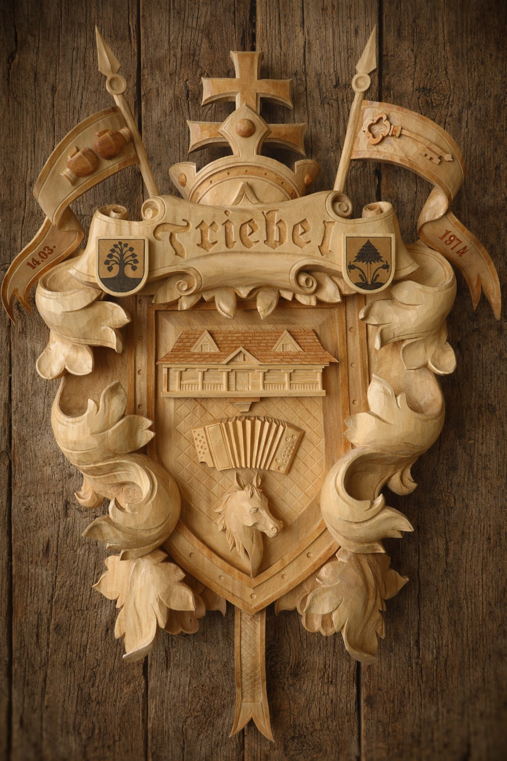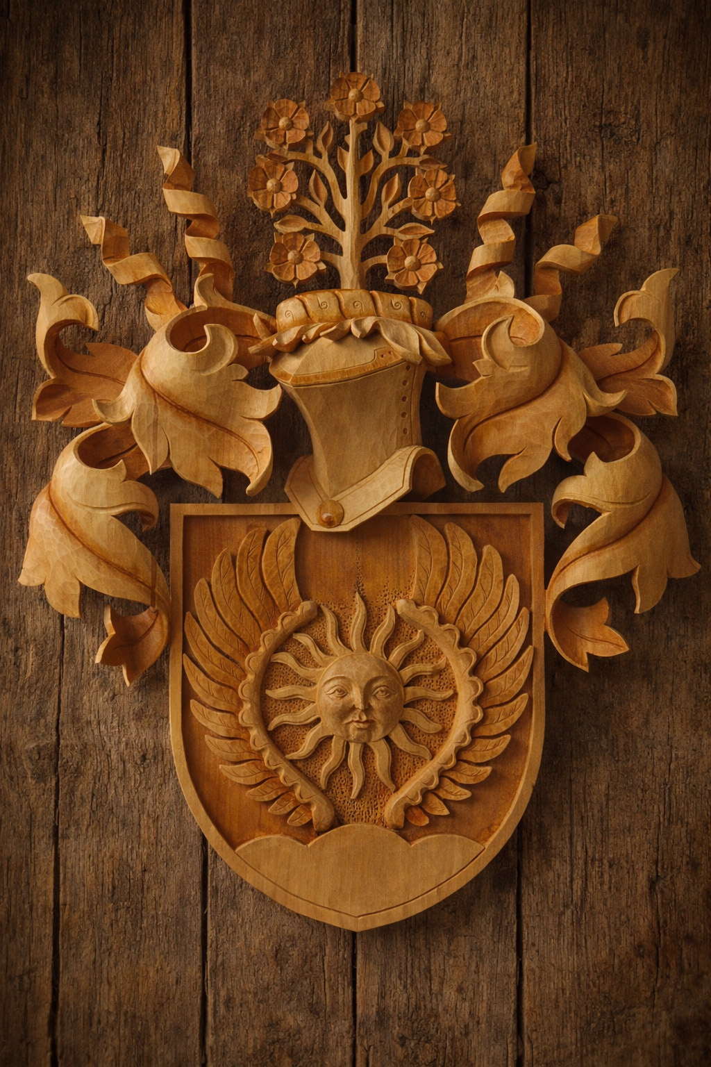 Táto drevorezba erbu bola ručne vyrezaná v našom ateliéri pre súkromnú osobu z lipového dreva technikou hlbokého reliéfu. Erb svojou symbolikou vystihuje najmä záujmy svojho majiteľa i jeho rodiny. Zahŕňa i významnú rodinnú nehnuteľnosť a znaky obcí, odkiaľ majiteľ pochádza a kde býva.[viac fotografií]