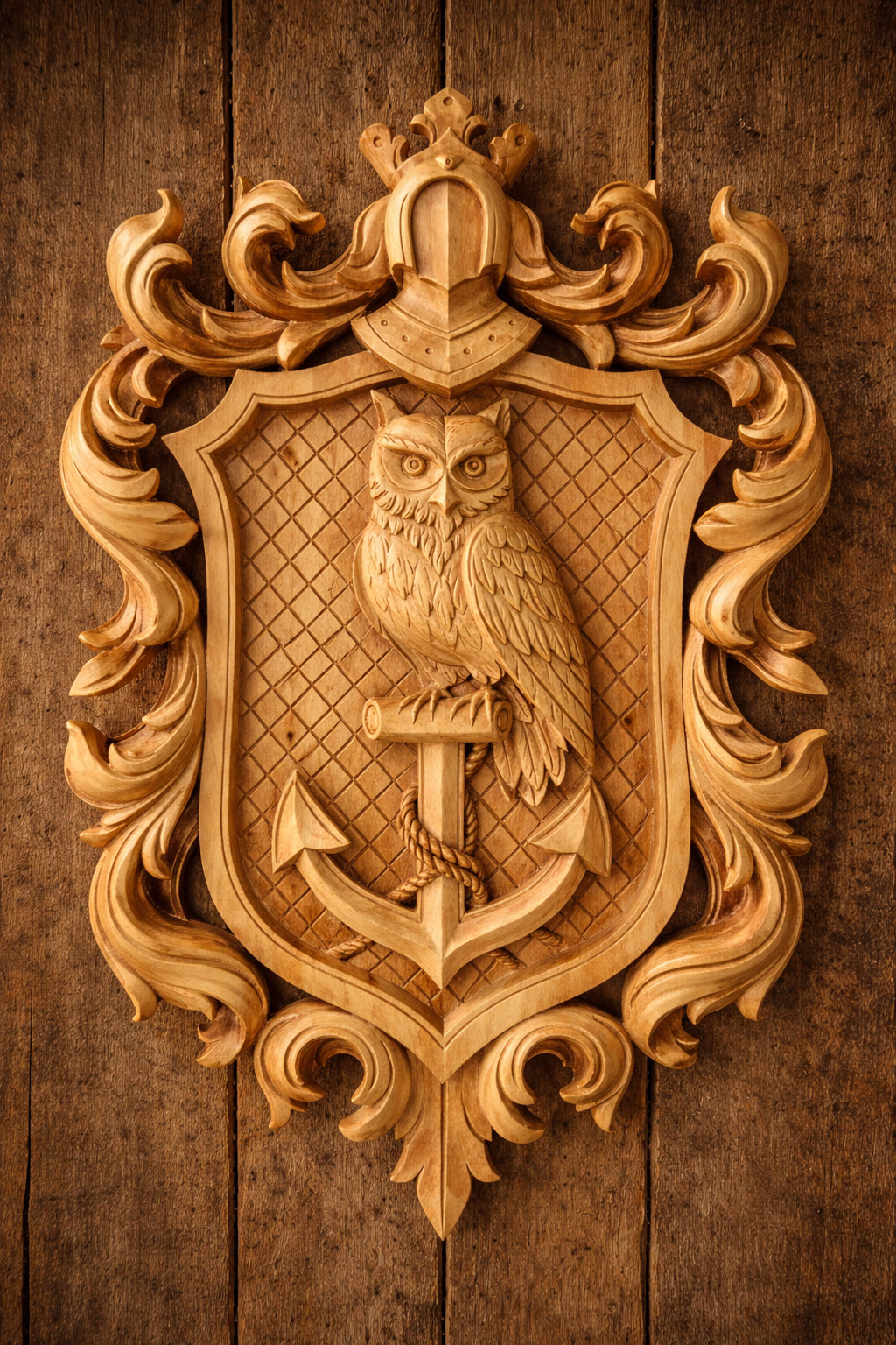 Tenro erb sme vyrezali ručne v našom ateliéri z lipového dreva pre súkromnú osobu, ktorá si ho sama navrhla. Jedná sa o hlboký reliéf rezby, takže z rezbárskeho hľadiska ide o náročnú techniku. Erb však vďaka tomu získal väčší objem a priestorovosť. Kombinácia rastlinných ornamentov sa harmomicky spája s motívom sovy a kotvy.[viac fotografií]