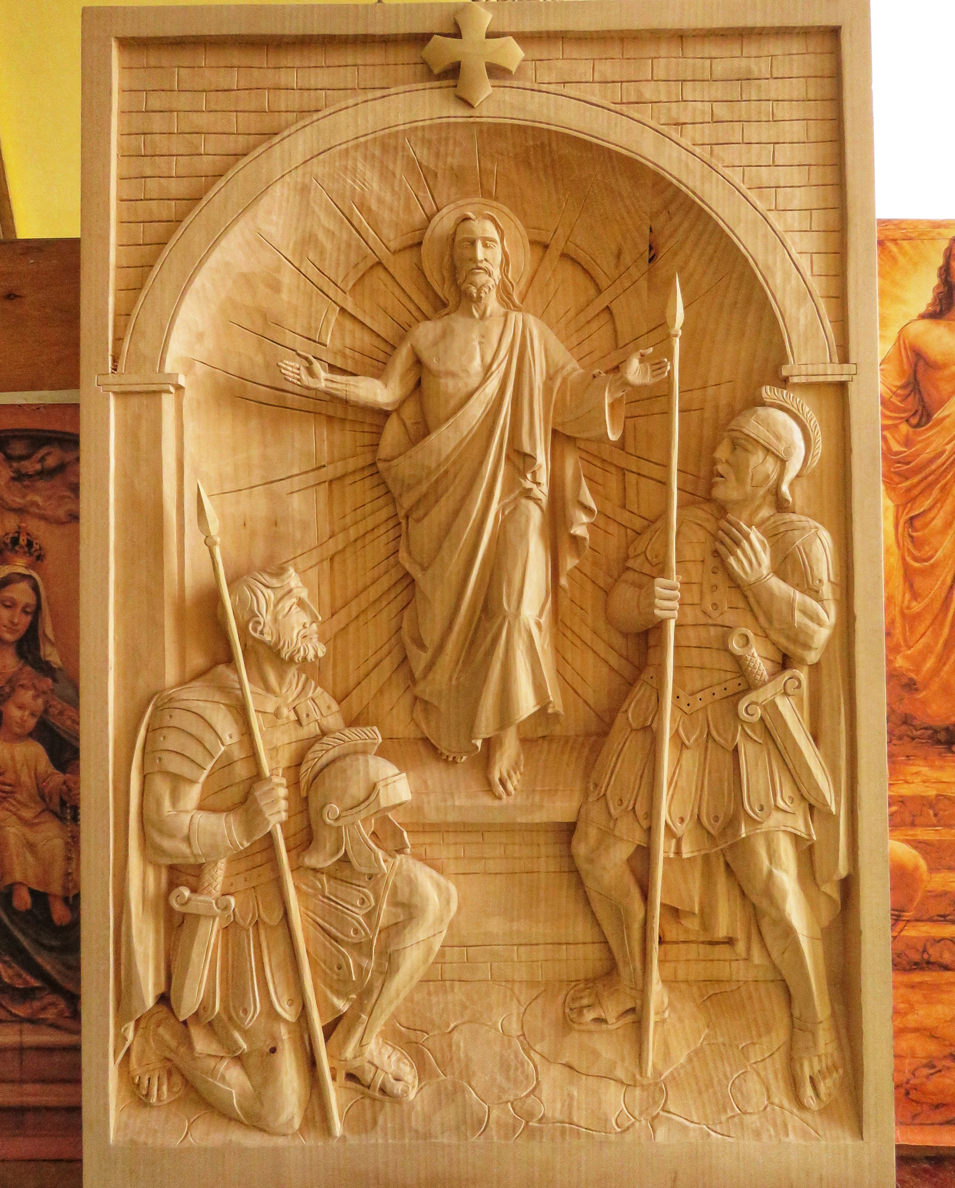 Ponúkame Vám pohľad na krížovú cestu, ktorú sme vyrezávali pre farnosť Suchá Hora. Jedná sa o dvanáste zastavenie. Drevorezba je vyrezaná detailným a realistickým spôsobom z lipového dreva. Formát 115x60cm. [všetky obrazy]